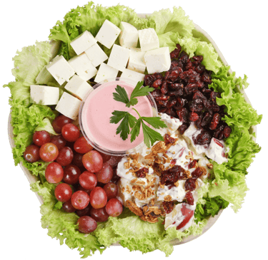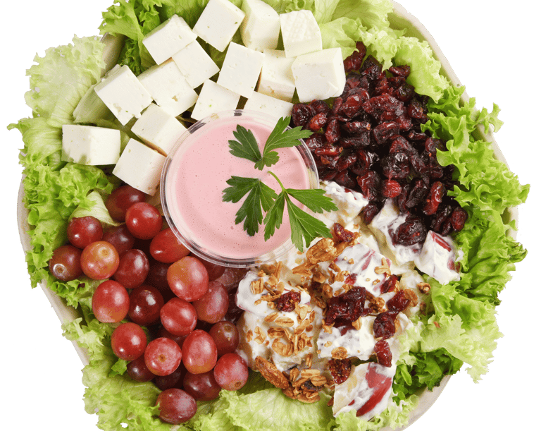 base: lechugatoppings: ens de manzana, uvaaderezo: arandanoproteina: queso panelacrocante: arandanos