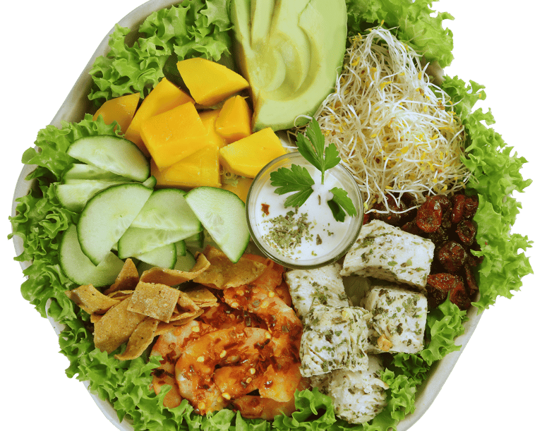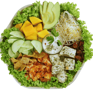 BASE: LECHUGATOPPINGS: DURAZNO, AGUACATE, PEPINO, GERMEN DE ALFALFAADEREZO: CESARPROTEINA: PECHUGA FINAS HIERBAS, CAMARONES ENCHILADOS CROCANTE: aRANDANOS, TORTILLA