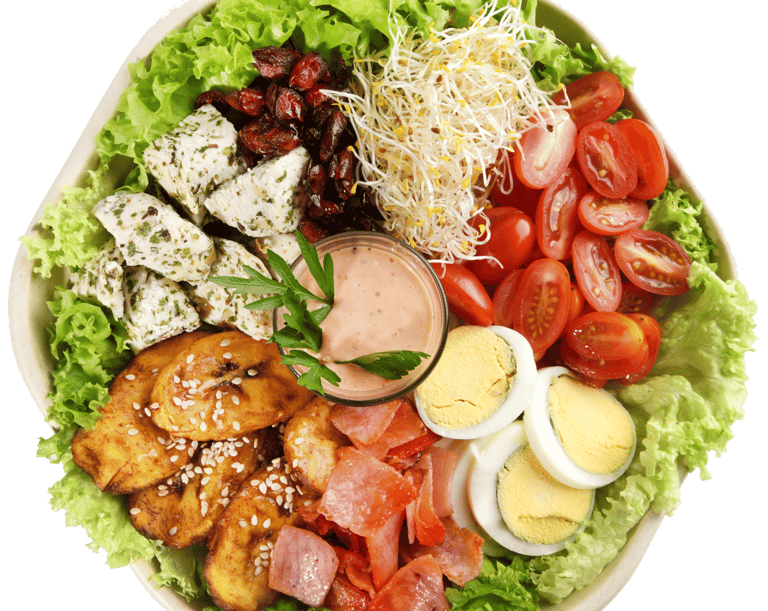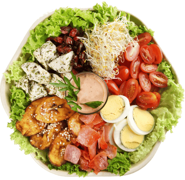 base: lechuga toppings: germen de alfalfa, jitomate cherry, huevo cocido, platano machoaderezo: mil islasproteina: pechuga finas hierbas, pierna españolacrocante: arandanos